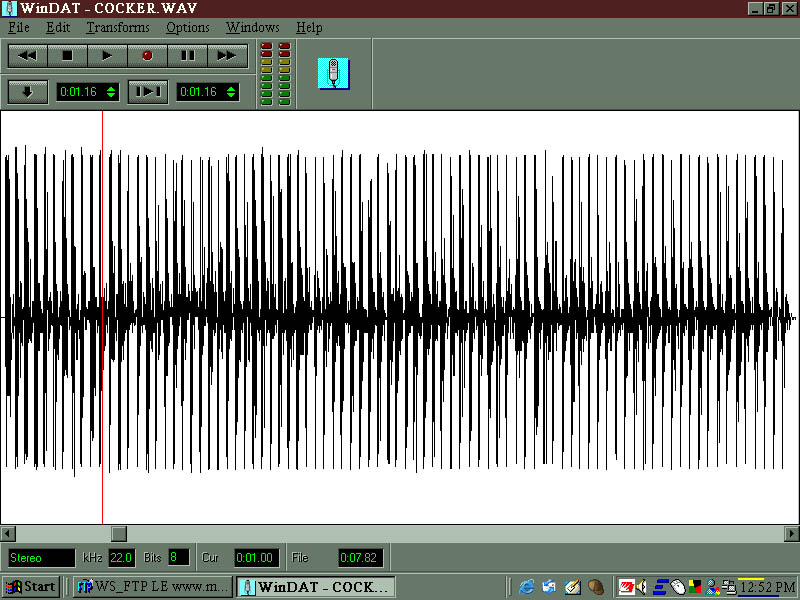 Also, the file isn't looped, that's seven solid seconds of 11 bps. Here is a screen shot of the .wav file. The red line is at exactly one second, and each spike is a shot. Click on it for the full picture.