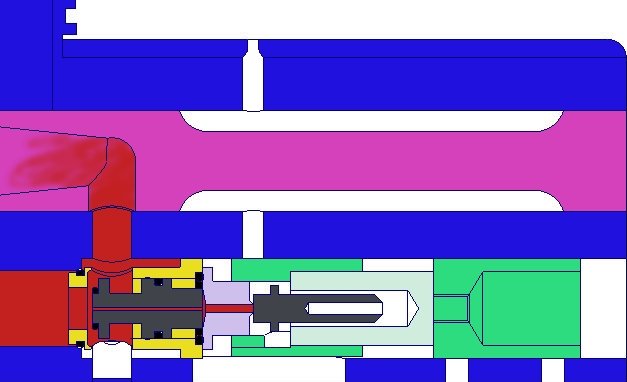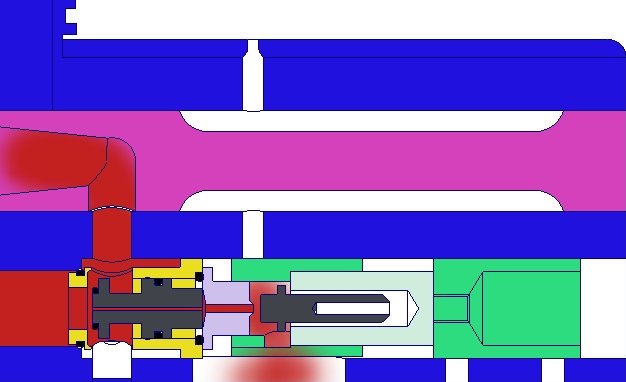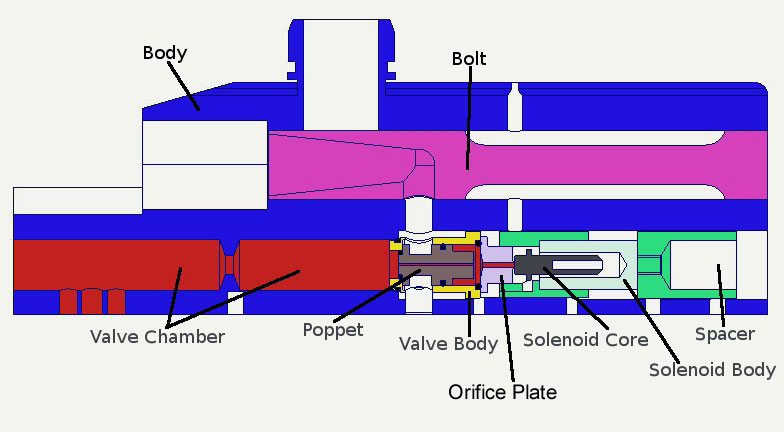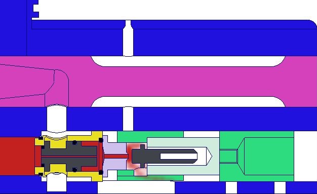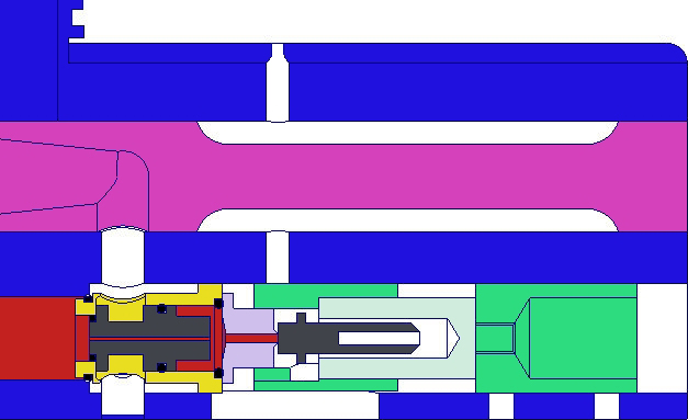 in PSI by the surface area in square inches. In both cases, it comes out to 50lbs of force being created, so the piston will sit in the middle if both sides are pressurized at the same time. So, what does all of this have to do with the MQ? Simple, the poppet in the mQ is a balance piston. Air pressure is applied to both sides of the poppet, and the difference in the surface area forces the valve to seal. Now that you know how each part of the system works, here is how they both work together: The parts listed do the following jobs: Valve Body: Holds the poppet, seals against the body of the gun, and the orifice plate. Poppet: Seals against the valve body, and moves to allow air into the bolt to fire the ball. Poppet Spring: Provides force to push the poppet closed after the pressure has dropped from behind it. Orifice Plate: Seals the back of the valve body, provides a small diameter air passage for the solenoid to seal. Solenoid Body: Holds the solenoid, allows pressure to vent from the rear of the valve body. Solenoid Core: Seals the back of the orifice plate, moves to allow air to vent from the read of the valve body Solenoid Core Spring: By pushing the solenoid core against the orifice plate, it creates the seal while the valve is at rest. Spacer: Holds everything in, and provides the force needed to seal the valve body to the gun body. Here is a close up of the valve installed in a gun, and pressurized. The red in the valve chamber is 300 PSI or so. ![]() You