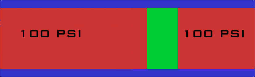 working. They are there in real life, the diagram is not 100% accurate. One of the missing springs fits between the poppet, and the orifice plate. This spring gives the poppet a push once the pressure has dropped on both sides of the poppet as the ball fires. The second spring sits around the solenoid shaft, pushing the shaft against the orifice plate. This creates the seal on the orifice plate when the system is at rest. Let's take the air pilot part first. In the case of most mechanical guns, the movement of the trigger releases the sear. That allows the hammer to be driven forward by the main spring, eventually hitting the valve stem, and opening the valve. On mechanical guns that have been upgraded to electronic frames, that linkage is still there, and is still being used. In the case of a cocker, an electronic solenoid is used to lower the sear, and thus replaces the mechanical movement of the trigger. The problem is you still have to create enough force on the sear to overcome the drag of the sear on the hammer lug. The stiffer the main spring is, the more force will be required, and the fewer shots you will get out of a battery. On the MQ, that mechanical linkage is removed completely. The sear solenoid, sear, sear spring, and the mechanical action of the hammer lug catching on the sear are all replaced by changing the pressure in the valve body it's self. This pressure change being used to move things is called an air pilot. When the air pilot activates, it uses a small amount of electricity from the battery to power the solenoid. The solenoid shaft is then pulled away from the orifice plate, allowing it to vent the pressure in the rear of the poppet. Now, since the pressure being vented already wants out, there is much less power needed to compress the spring around the solenoid shaft. The solenoid doesn't have to compress the spring by it's self, the pressure is already pushing against it, and helping to open the seal. By only using a small solenoid, and having the pressure do most of the work, the mQ saves battery life in a big way. Think of it this way: The air pilot is like a three way valve on a mechanical cocker. It only takes a little energy to move it, but you are changing the pressure balance in the system, and allowing the system to do the work for you. Now, the weird part, the balanced piston.... OK, let's forget about the MQ for a minute, and look at a plain old cocker ram. You put pressure into one side, and the shaft moves out. You empty the one side, and pressurize the other side, and the shaft moves in. That is what is used to cock, and load our guns. So, what happens in you put pressure on both sides at the same time? Logic would say the ram shaft would go to the middle of the travel, and stop there. Well, logic may say that, but a simple test says logic is wrong. The surface of the ram's piston has different working surfaces on each side, because of the ram shafts end is outside of the ram, the air pressure can't use it to generate force. Pressure can only create force when it is working against a surface. The more surface something has, the greater force any set pressure will be able to create. The more pressure applied, the more force generated on that surface. OK, now that my poor writing has confused the hell out of most people, take a look at this example: ![]()